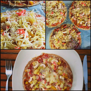 Nüüd kui tortillad on valmis, kata need pitsa valmistamiseks mõeldud tomatipastaga. Lao peale omal vabal valikul kate. Minu eelistuseks on tavaliselt krevetid, makra, ananass ja paprika. Kõige peale (laktoosivaba)juust ja parmesan(samuti laktoosivaba).